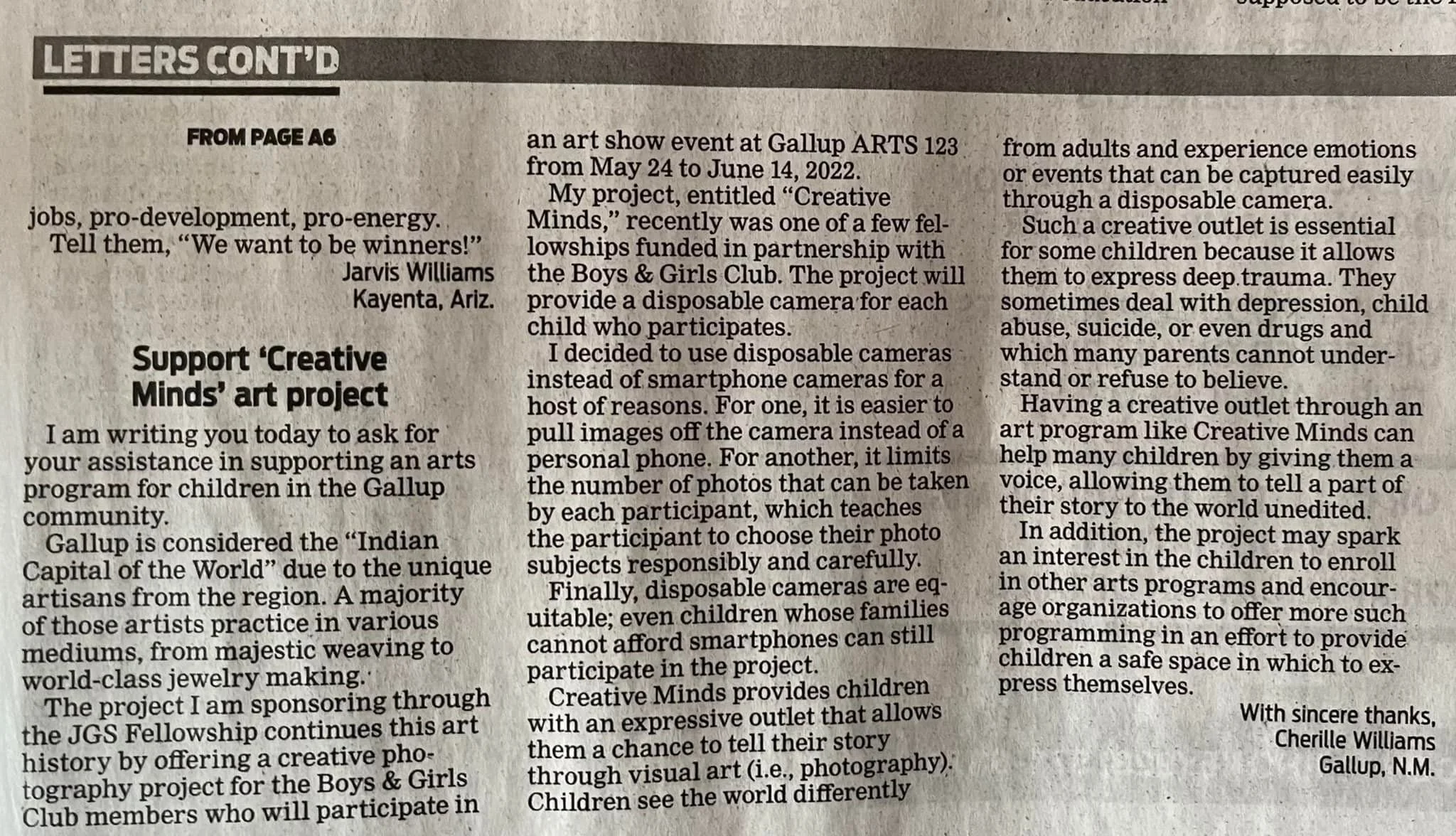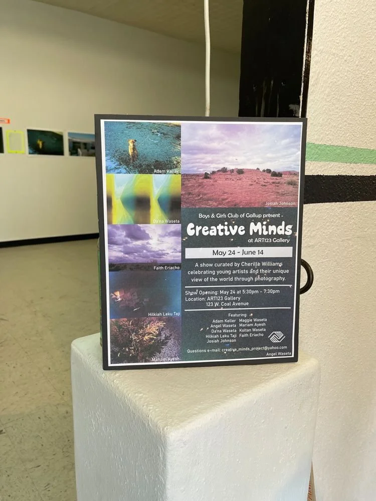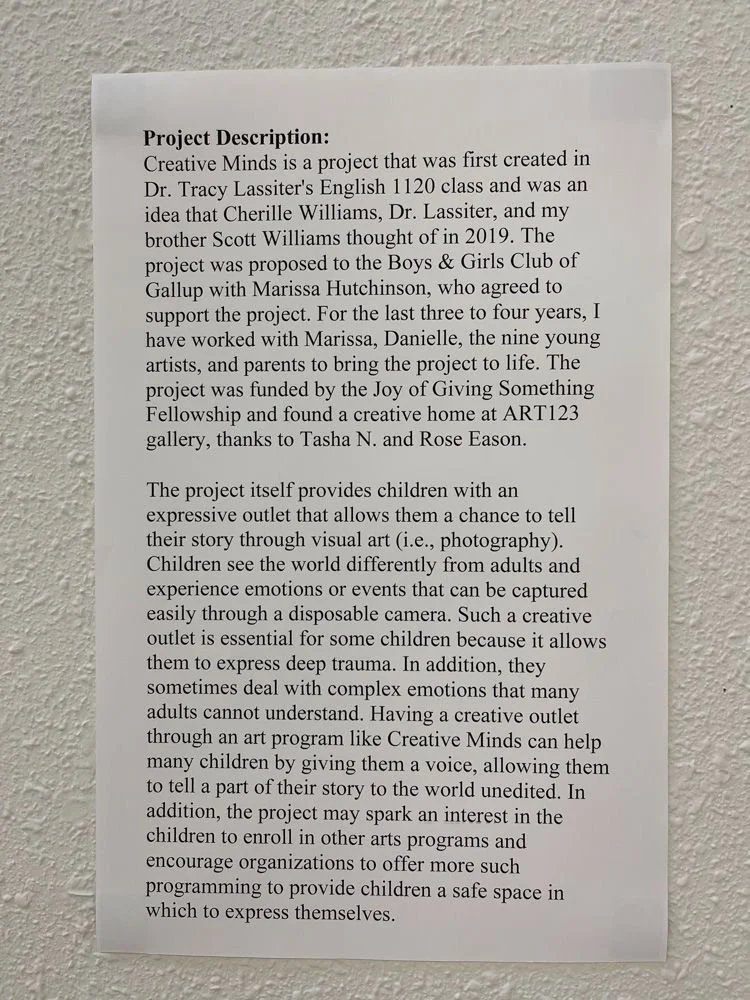 Creative Minds is a project that was first created in Dr. Tracy Lassiter's English 1120 class and was an idea that Cherille Williams, Dr. Lassiter, and my brother Scott Williams thought of in 2019. The project was proposed to the Boys & Girls Club of Gallup with Marissa Hutchinson, who agreed to support the project. For the last three to four years, Cherille worked with Marissa, Danielle, the nine young artists, and parents to bring the project to life. The project was funded by the Joy of Giving Something Fellowship and found a creative home at ART123 gallery, thanks to Tasha Nez and Rose Eason.