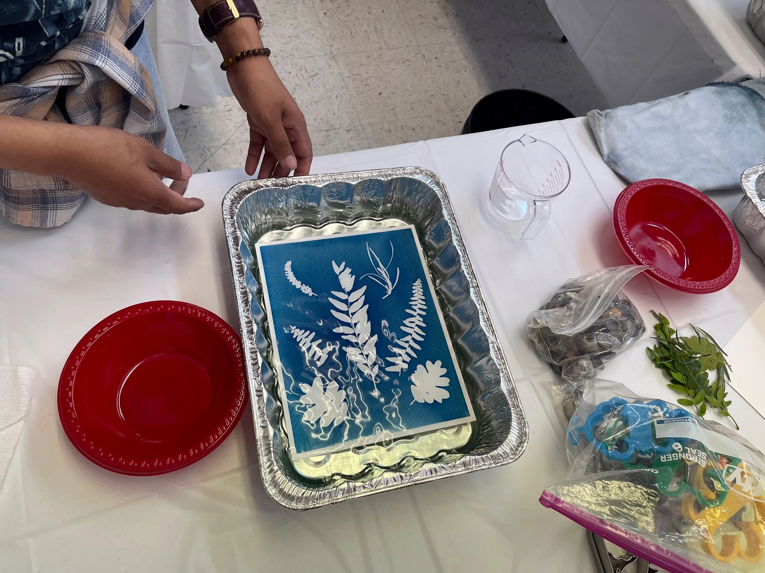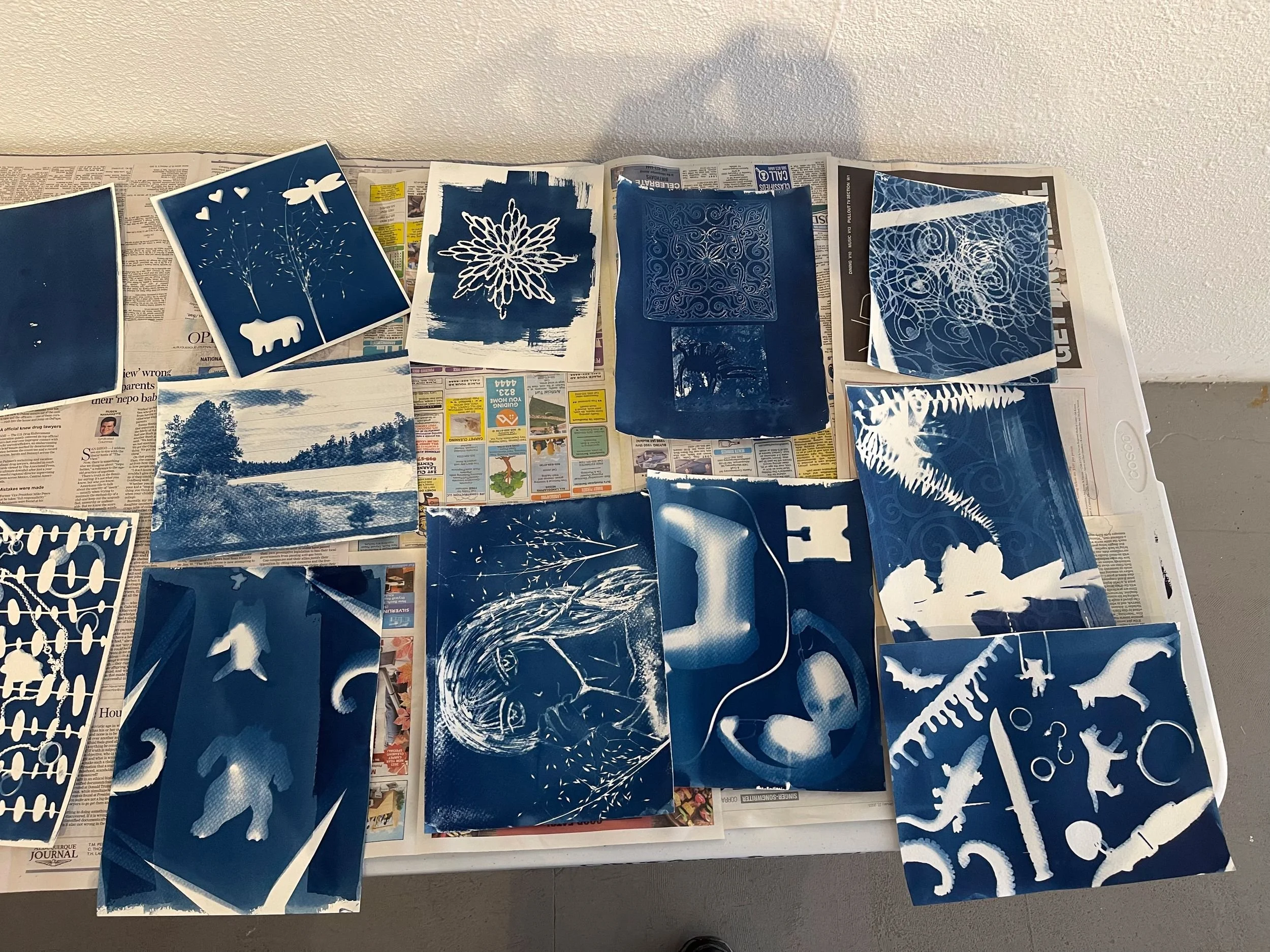 To create visual memories using the most experimental forms of photography, cyanotype printmaking. People attending the workshop use objects with sentimental value while using transparent materials and plant life and encouraging creative play by adding paints and maskers on top of the prints they make during the workshop.